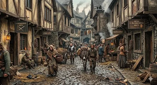 "Platím!" Zakřičel Vašek Šikmonos na hospodského, dorazil holbu piva a hodil na stůl několik ošoupaných mincí. Ze zšeřelého a zakouřeného lokálu se vypotácel na zablácenou ulici a vrávoravým krokem si to šmátral blátem směrem k rynku. "Už by taky mohli vydláždit ty ulice, v tomhle město nikdo nic nedělá!" proběhlo mu hlavou, když prošlápl už čtvrtou kaluž. Vzápětí zabočil a zamířil, za zvuku čvachtajících bot, do nitra velkého domu na jehož vývěsním štítu byla vymalovaná ruka se zlaťákem. Otevřel dveře a z osvícené místnosti se ozvaly vzrušené mužské hlasy: "To je dost, že jdeš. Už jsme měli začít." V sále seděli muži v otrhaných a špinavých šatech ze kterých byla jen lehce cítit jejich zašlá sláva. Začalo cechovní zasedání...