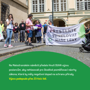 Hnutí DUHA předalo poslancům a poslankyním výzvu Divočina na beton, kterou podepsalo přes 23 tisíc lidí. Cílem je, aby podpořili dobrý národní park Křivoklátsko a kvalitní zákon o ochraně přírody a krajiny.